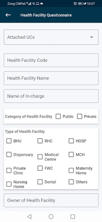 Registration and mapping of public and private health facilities app will be used by survey teams during their field work. Authorized field worker using their credentials will visit all public and private health facilities and LHW health houses during their field work. They will fill basic information of health facilities like name, address, location, service delivery availability, essential health care provider staff availability using this app. Moreover, field worker will snap pictures of important area of health facilities like main entrance, display board, waiting area of patients, outpatient department rooms, indoor section, wash rooms etc. This app will gather GEO coordinates to store location of health facility or health house. All this information will be stored in android phone as offline mode. Later this information and pictures may be up-synced on server using RESTFull APIs.