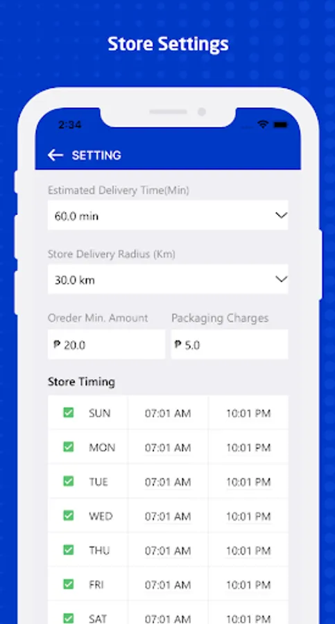 - Manage store details like store name, estimated delivery time, delivery charges, delivery radius, timing, products, etc.
