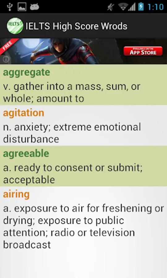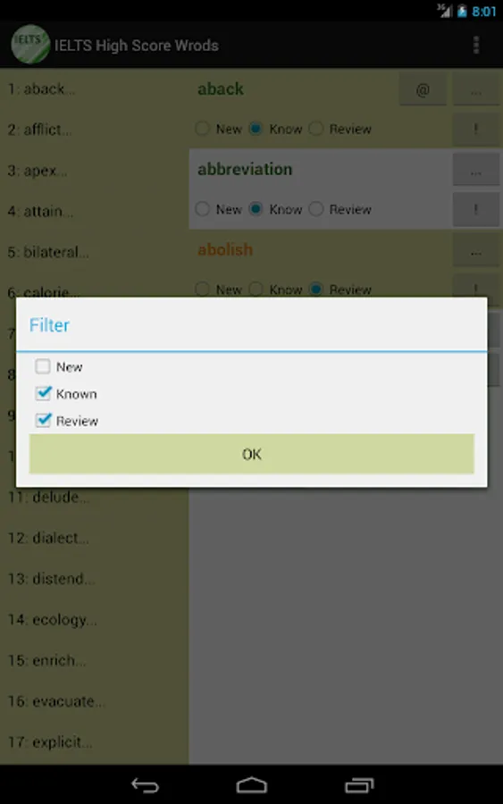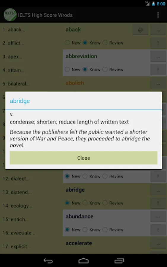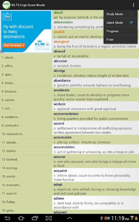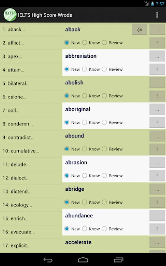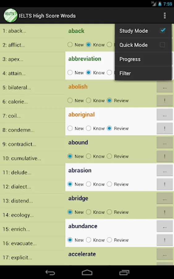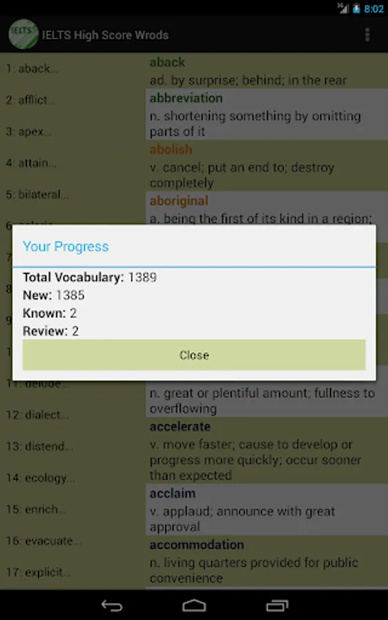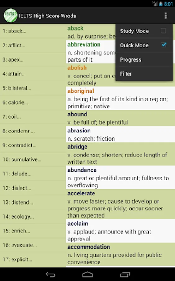 This vocabulary app features 1389 words, ideal for students who are working hard aiming for high scores in IELTS tests. This app divided these words into 47 easy-to-manage lessons. You can select and view only the words you want to study or review, and filter out words you already know to save time.