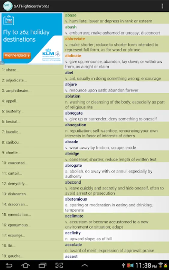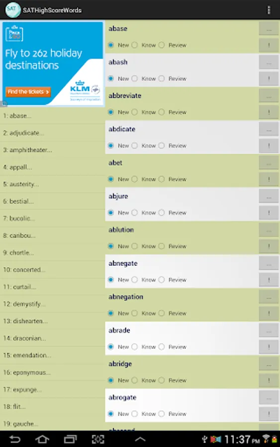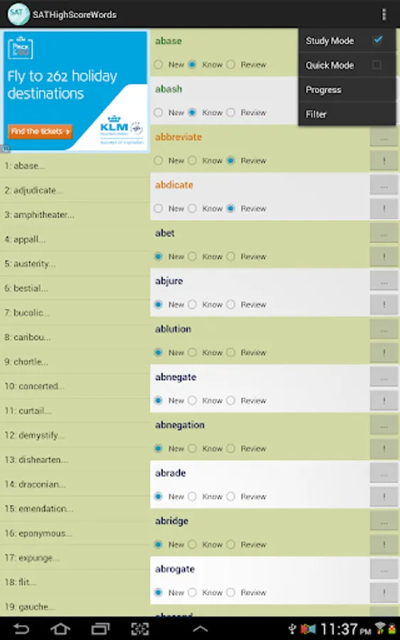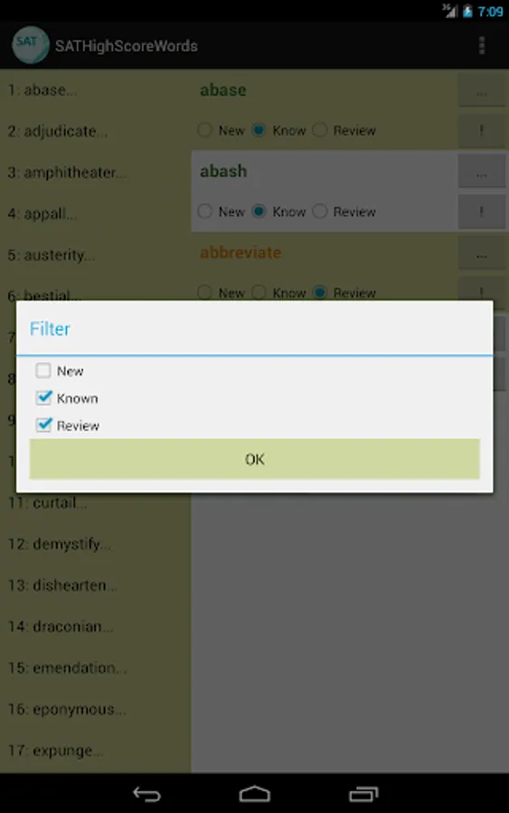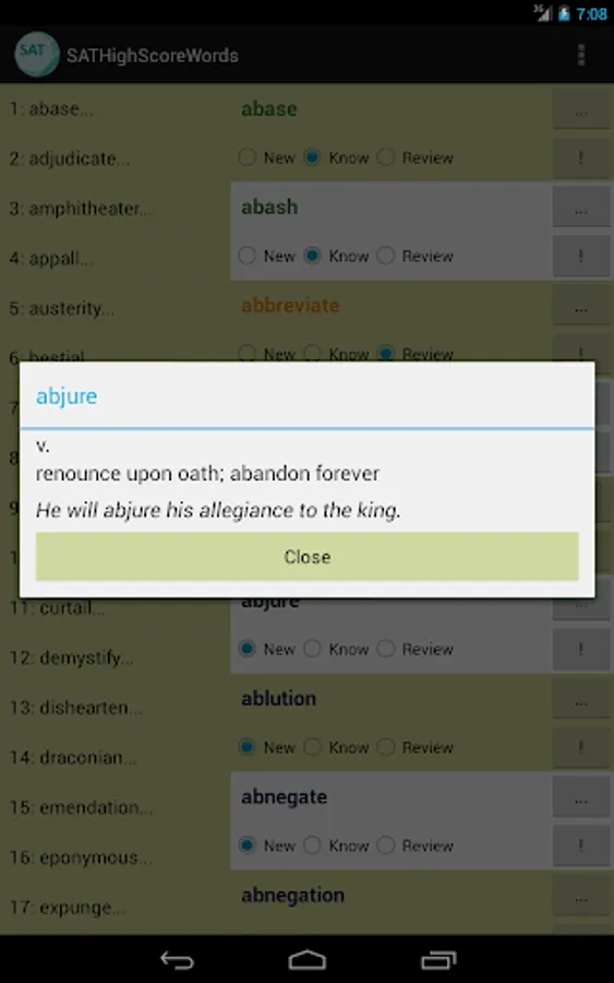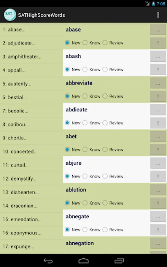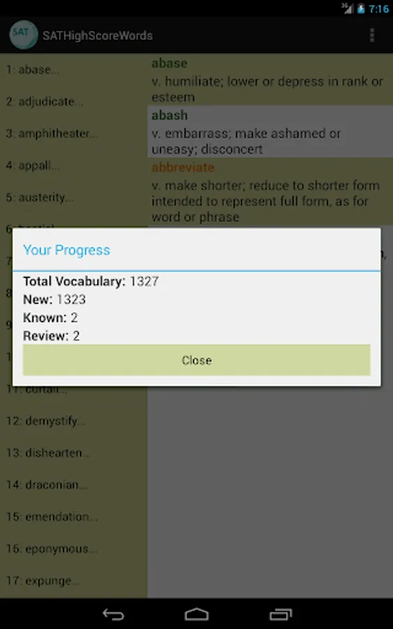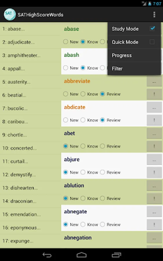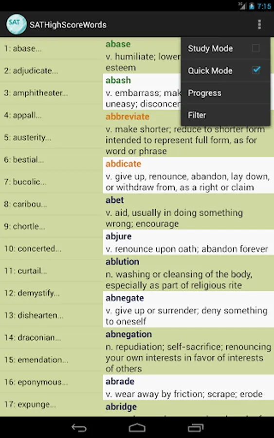 This vocabulary app features 1327 words, ideal for students who are working hard aiming for high scores in SAT tests. This app divided these words into 45 easy-to-manage lessons. You can select and view only the words you want to study or review, and filter out words you already know to save time.