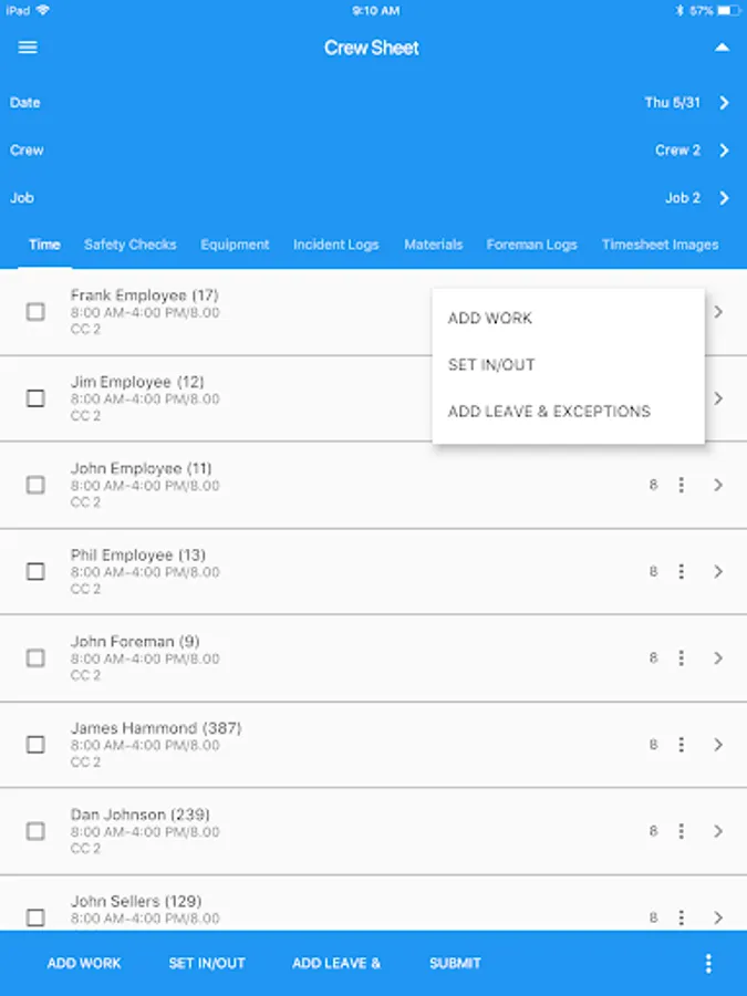 - Automatically carry forward employees, equipment, and other setup items each day.