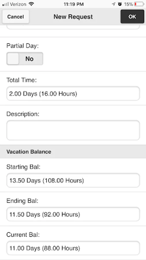 - Leave request balance forecast shows negative balances