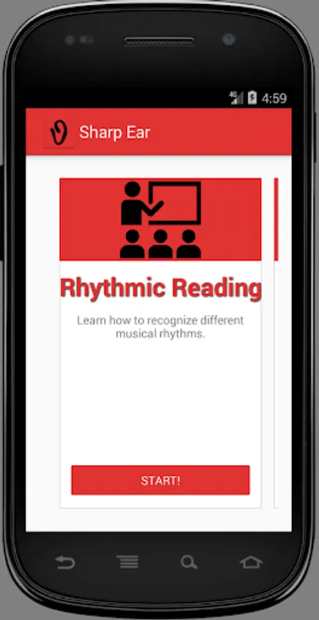 In this application, dedicated to the learning of rhythm, the user is invited to listen to the sound of rhythms, and later to detect them. After a training phase, the user can venture out and check how many rhythms he can hear in 60 seconds. The game can be carried out figure by figure or by phrases.