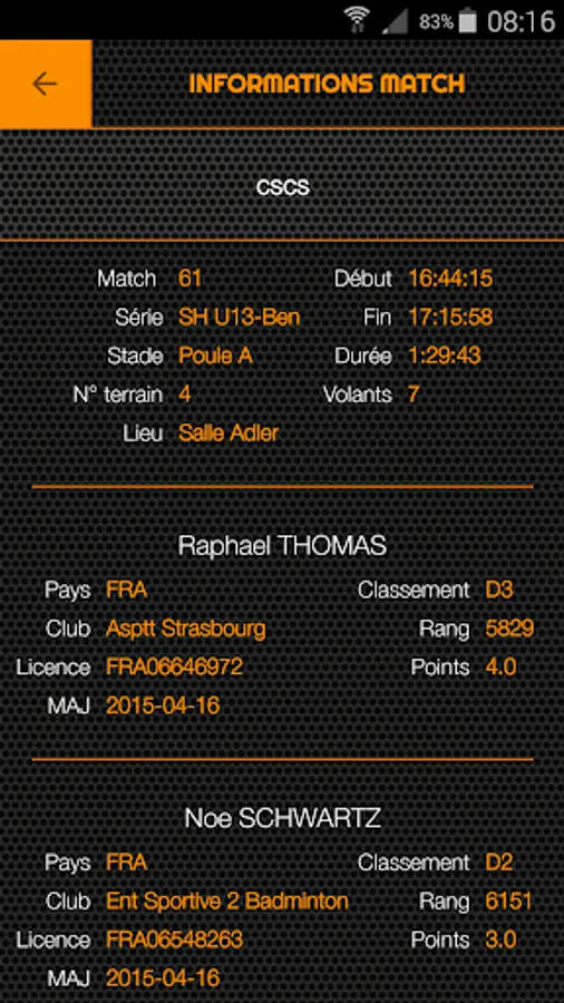 More than scoring, you can consult every details of a game, players informations and score of terminated Badminton games. And, of course, every match of Badminton planned or past.