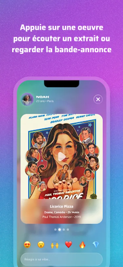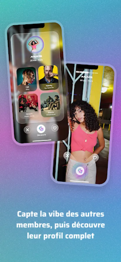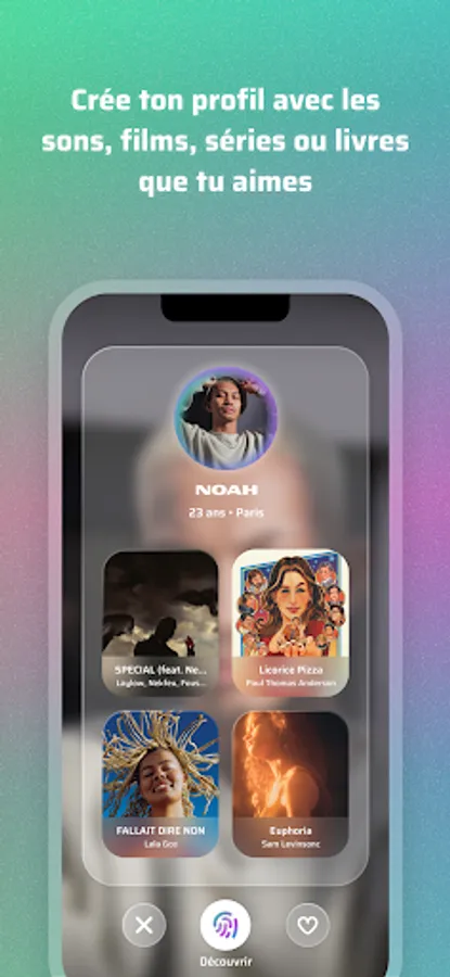 Meet people who have similar tastes to yours. First capture their vibe by discovering the sounds, films, series or books they have shared, then use the long press to reveal their photos!