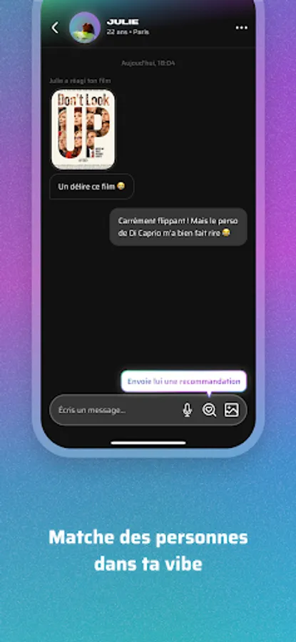 Do you find the "hi how are you" sucking too? Start an interesting discussion by reacting to a sound or a movie that your match has shared, in complete relaxation!