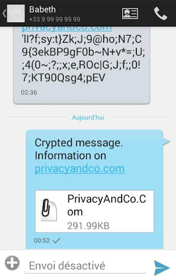 As easy to use as standard SMS / MMS Android applications, but with an encryption option, Privacy & Co is the only application that allows you to exchange in complete confidentiality.