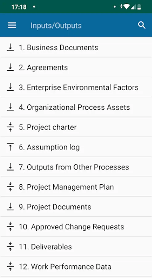 - list of Knowledge Areas, Process Groups, Processes, etc.;