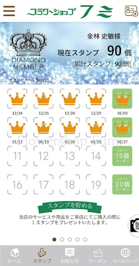 また、スタンプ数に応じてステイタスをご用意しており、各ステイタスに応じた特別なサービスもご利用いただけます。