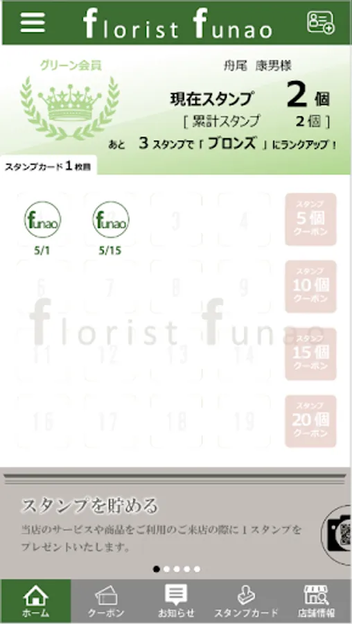 スタンプ5個貯まると300円分の切り花 プレゼント!
