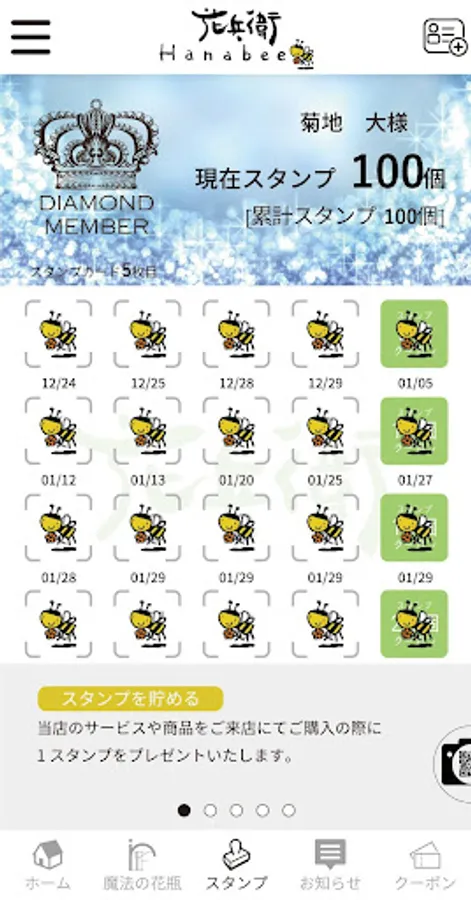 スタンプ数に応じてステイタスをご用意しており、各ステイタスに応じた特別なサービスもご利用いただけます。