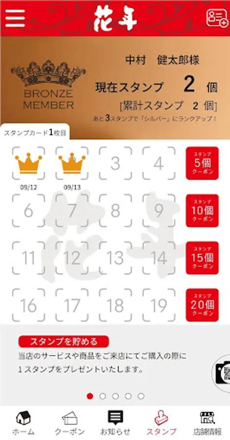 また、ご来店時にスタンプをゲットしてお得なクーポンも配信いたします。スタンプ数に応じてステイタスをご用意しており、各ステイタスに応じた特別なサービスもご利用いただけます。