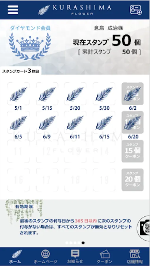 また、ご来店時にスタンプをゲットしてお得なクーポンも配信いたします。スタンプ数に応じてステイタスをご用意しており、各ステイタスに応じた特別なサービスもご利用いただけます。
