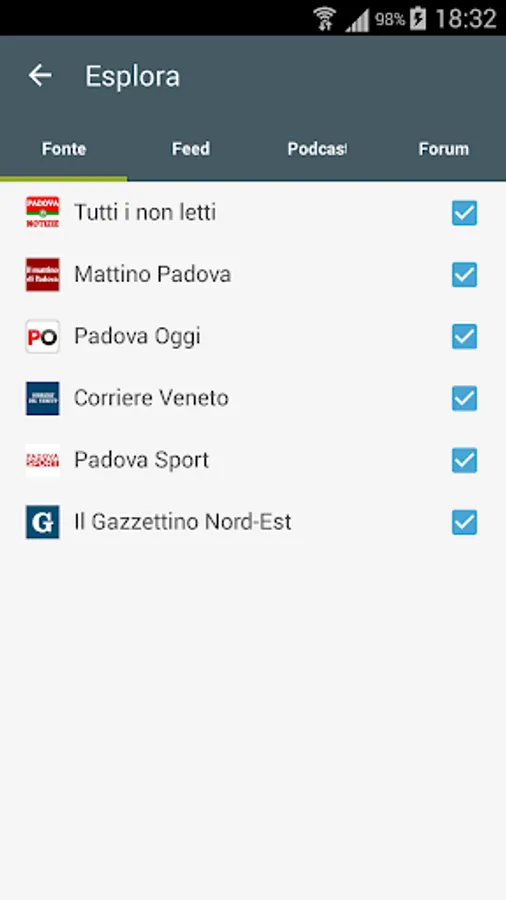 Through the "explore" function it is also possible to decide which sources to access and which to exclude simply by disabling the related entry (if, for example, you do not wish to receive news about Padova Calcio or the North-East just deactivate the related sources). in the "feed" section you can enter additional websites and online newspapers where you can receive news in real time.