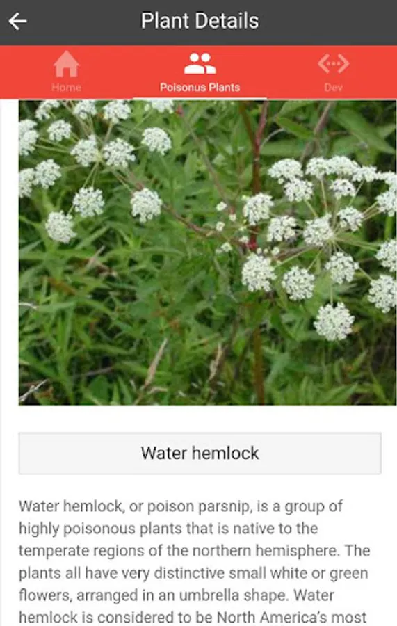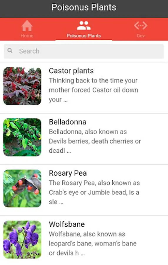 Poisonous Plants is a mobile application that lists some of the poisonous plants that could cause you skin irritation, get hospitalized,difficulty breathing, muscle tremors, convulsion, collapse or cardiac arrest.
