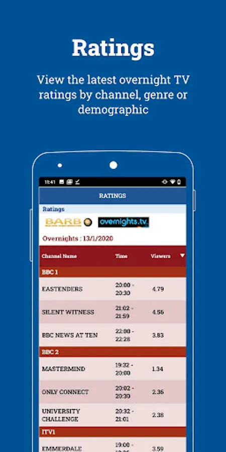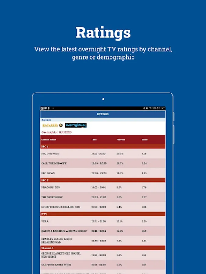 • Overnights ratings statistics – available every morning from your tablet for the top 12 channels