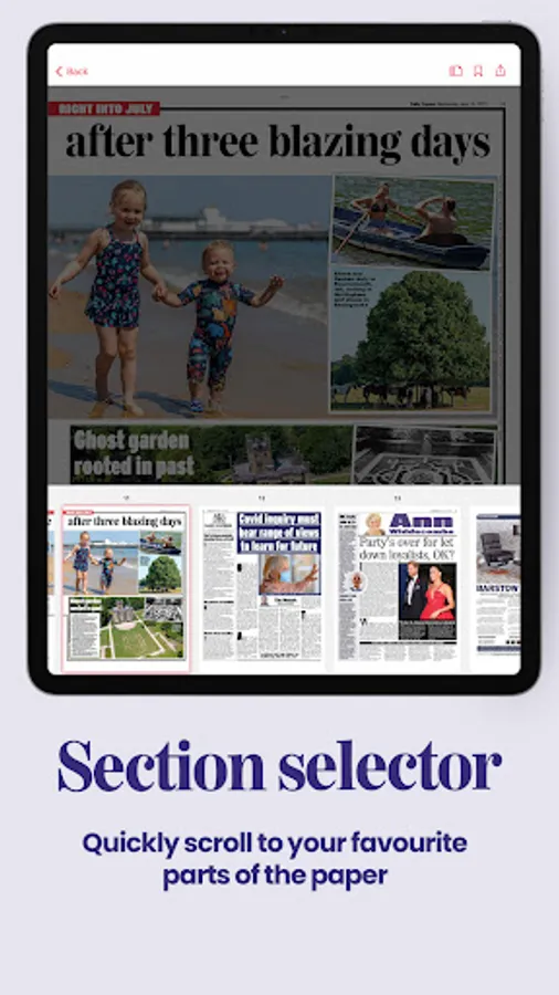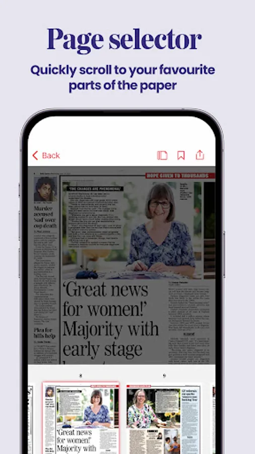 Flip your device and read the newspaper as a double-page spread or full screen single page, tap the page selector to choose a specific page to fast-navigate to. You can also download and save individual pages to enjoy offline and when you are on the go.
