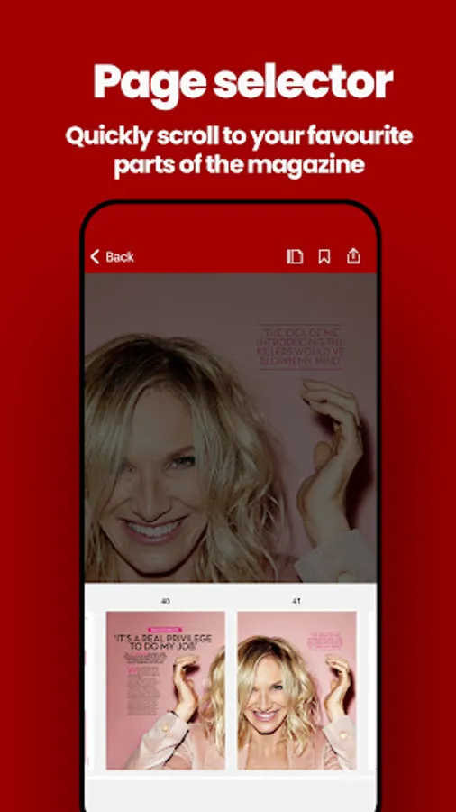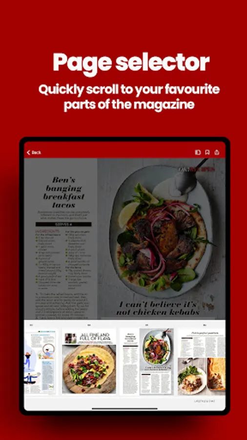 Flip your device and read the magazine as a double page spread or tap the page selector to choose from a thumbnail image of each page