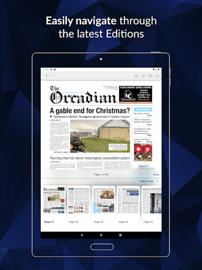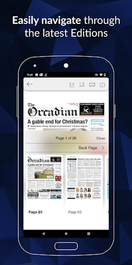 Flip your device to read the newspaper as a double- page spread or full screen single page, tap the page selector to choose a specific page to fast navigate to. The Orcadian App also features a zoom function to enable clearer reading of selected articles. You can also download and save individual pages to enjoy offline and when you are on the go.