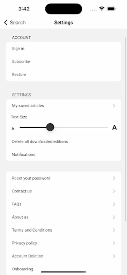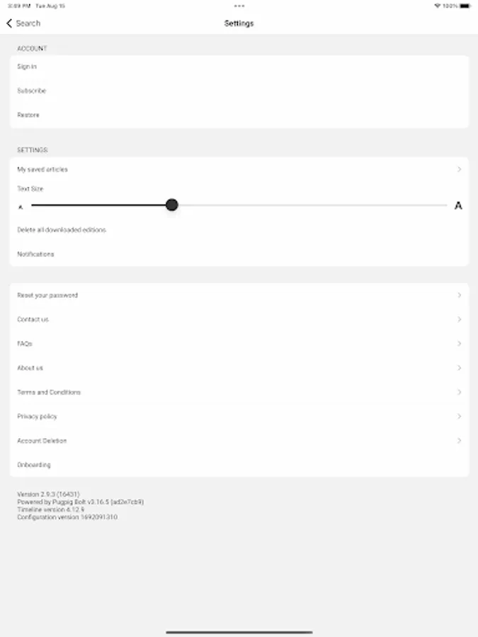 When viewing a paper or supplement, you can pinch and zoom to enlarge the pages and articles, swipe through or jump to the next or other pages, use the search functionality to find specific articles, and view full pages either in single page portrait or double page spread landscape mode.