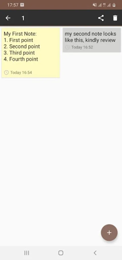 * on long press individual note, you can share note with other apps (e.g. sending a note to WhatsApp, Telegram, Gmail etc), or delete it if you no longer need it on your app