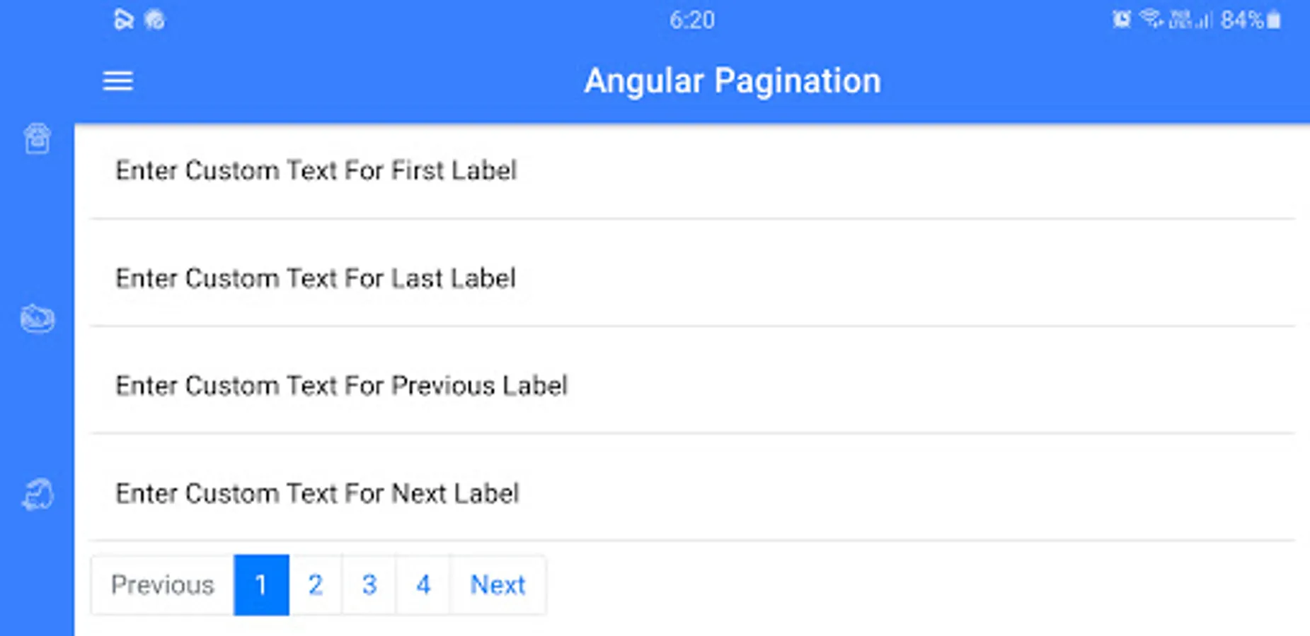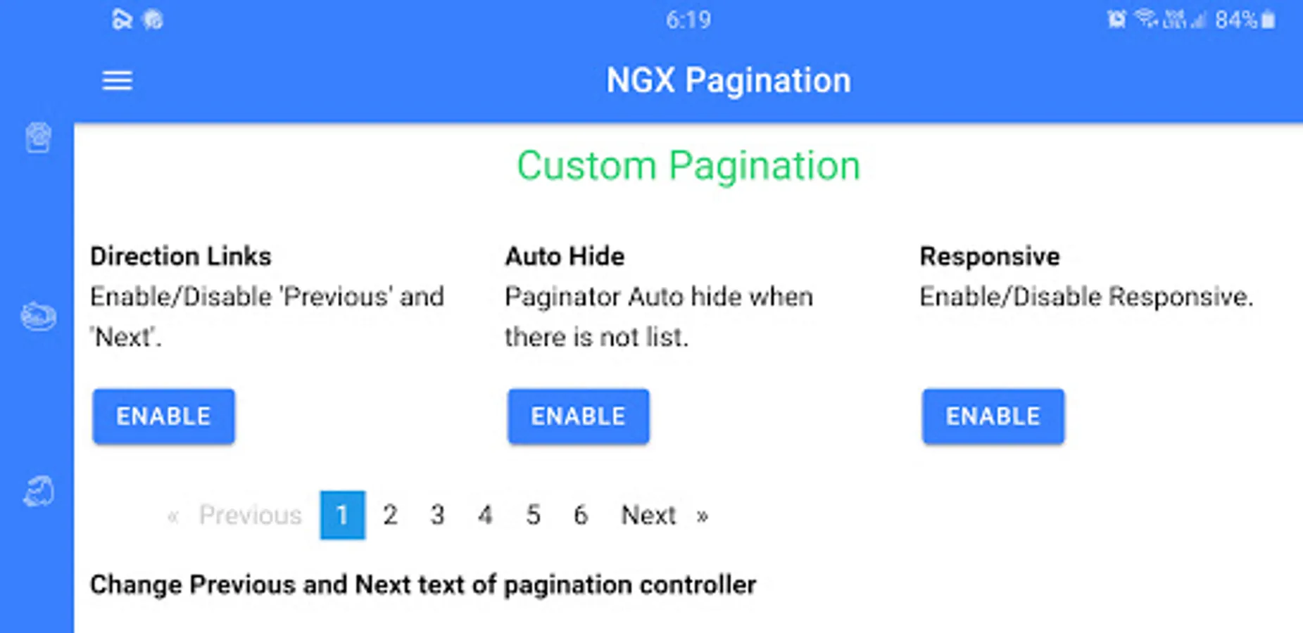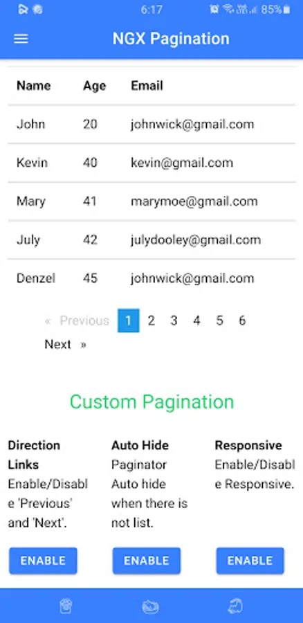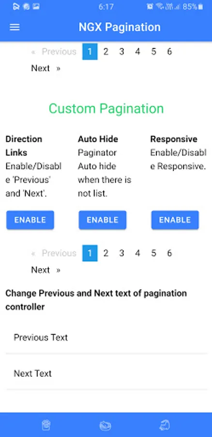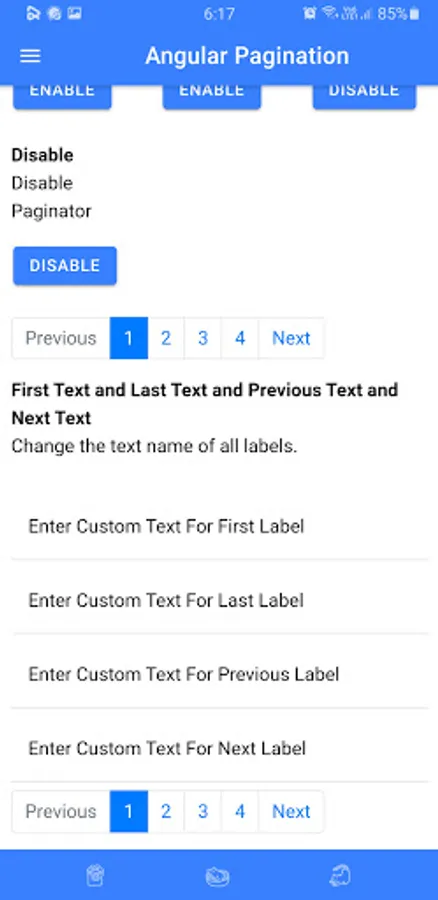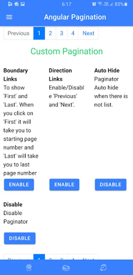 This app contains different pagination packages. This app allows the user to customize pagination and to see the features of different paginations. You can search these packages on any package manager like NPM and the name of the package is given on its title. Programmers can use it with any languages like angular etc. This app will save your time to see most features of pagination on an app then use it on your project.