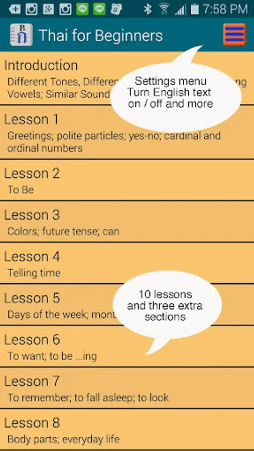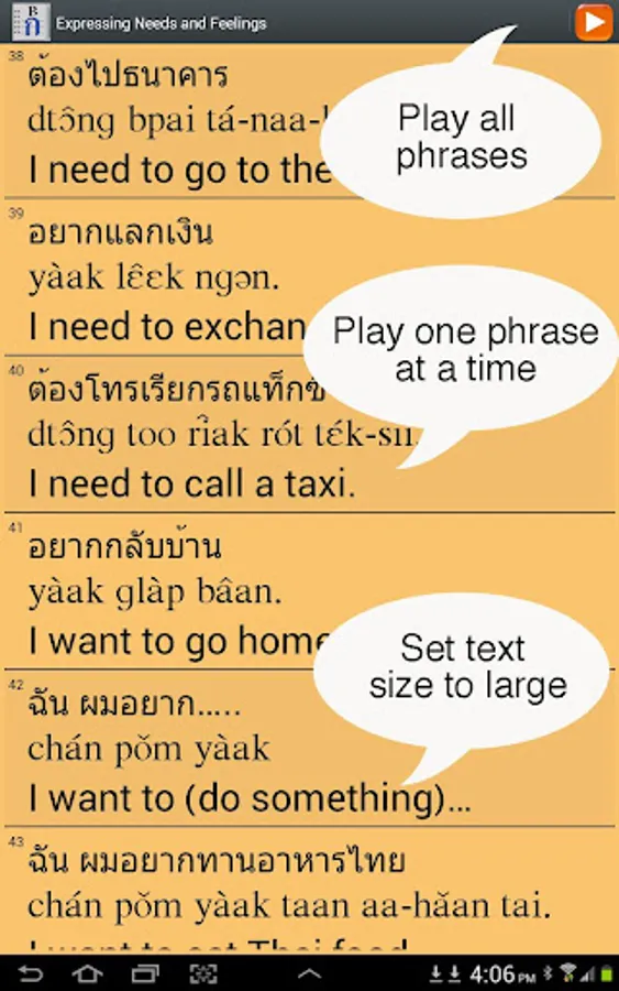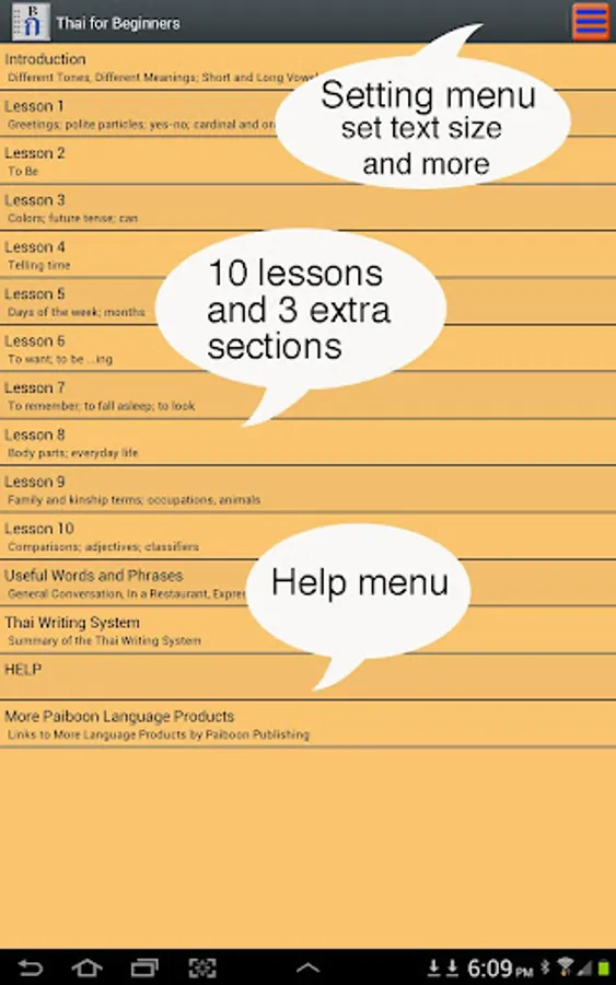 == Thai for Beginners app is ideal for beginning Thai students, or those who want to improve their basic Thai. Teaches speaking, listening and reading Thai with a native speaker and over 3,000 clearly recorded words and phrases.