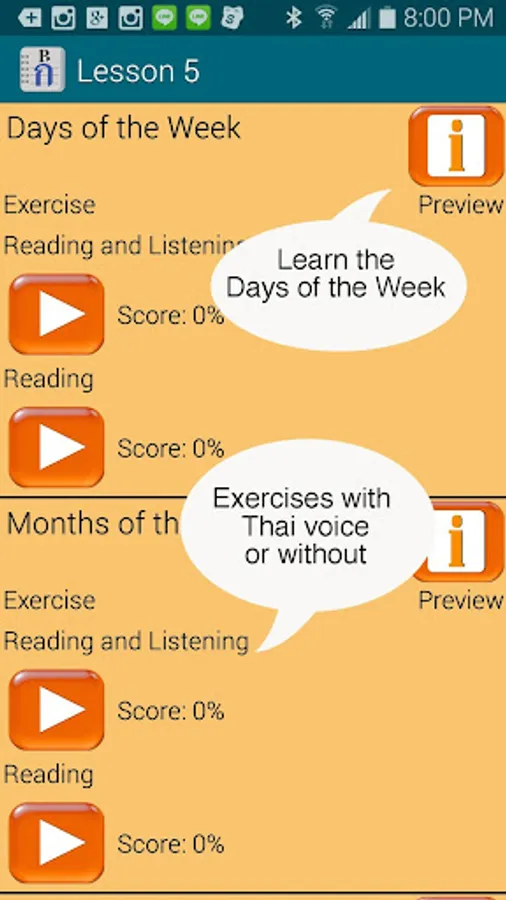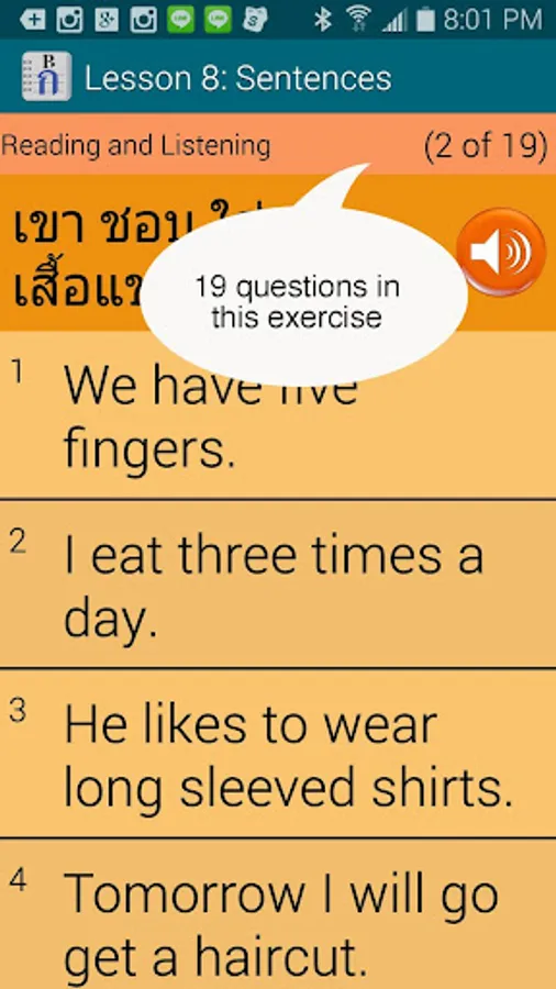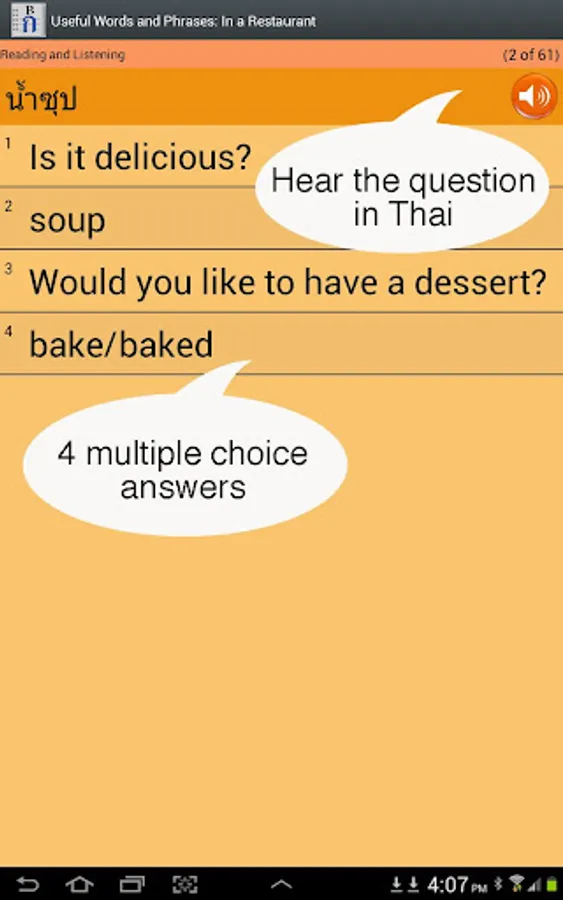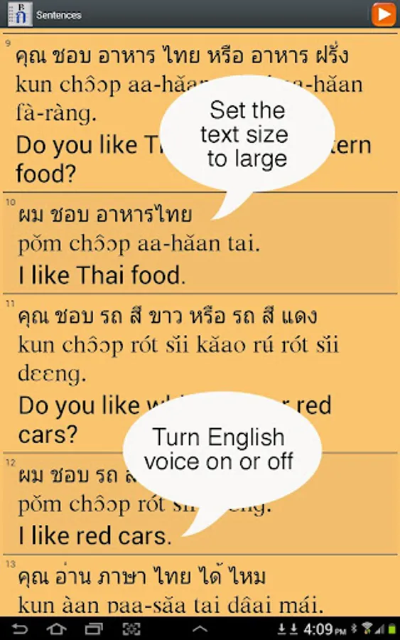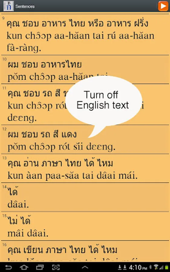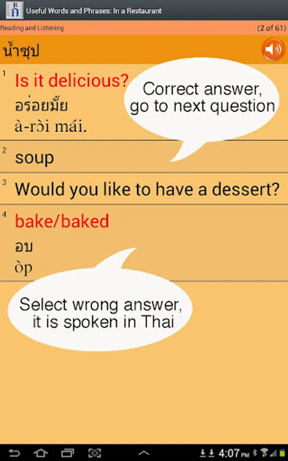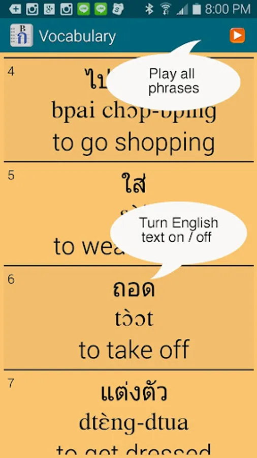 == English voice added, which can be turned on or off. Autoplay an entire lesson with English and Thai voice on. A great way for Thai speakers to practice their English pronunciation.