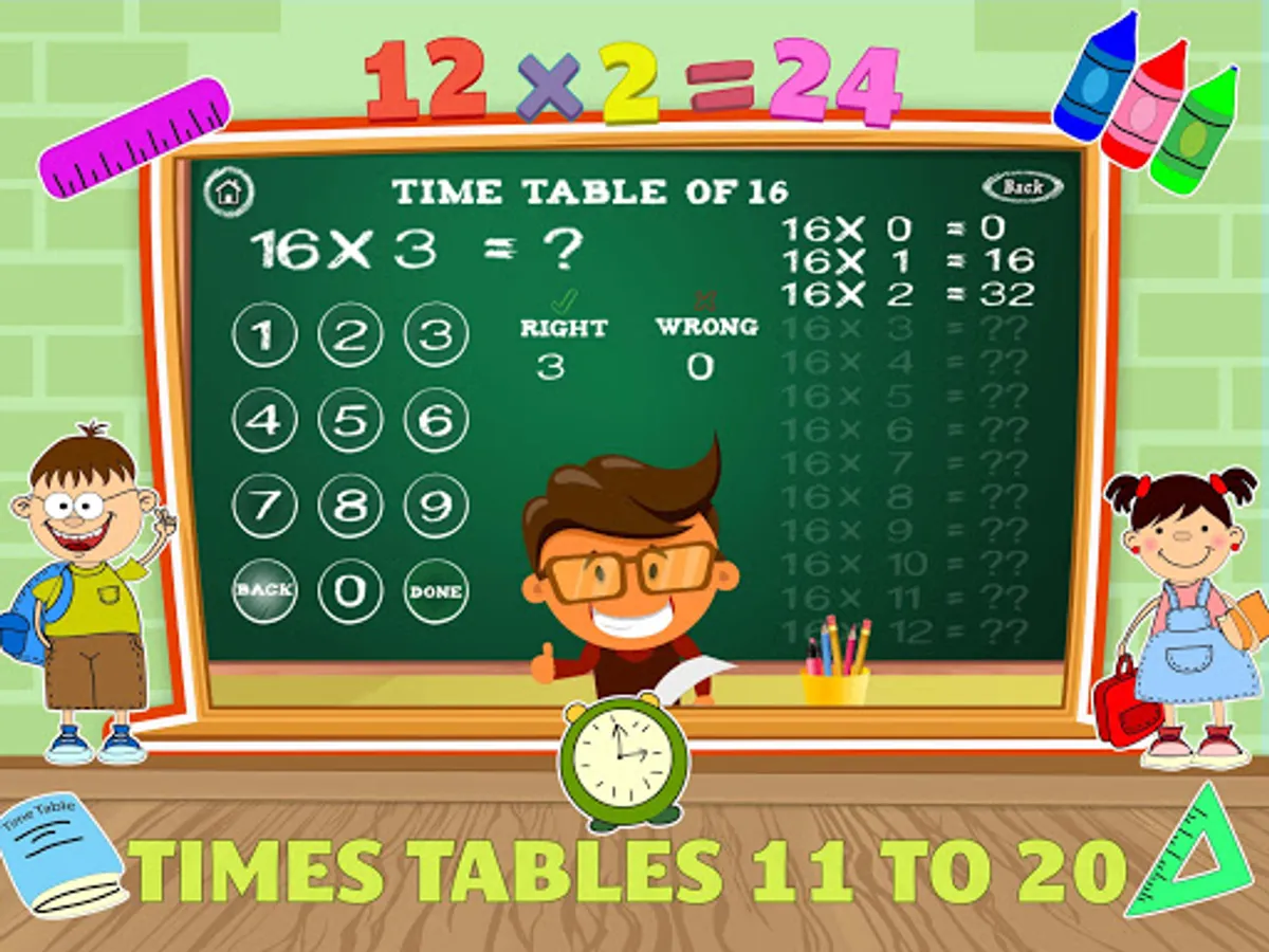 Times Tables from 11 to 20. For times tables from 1 - 10 please look at the first app in this times table games for kids series that we have.