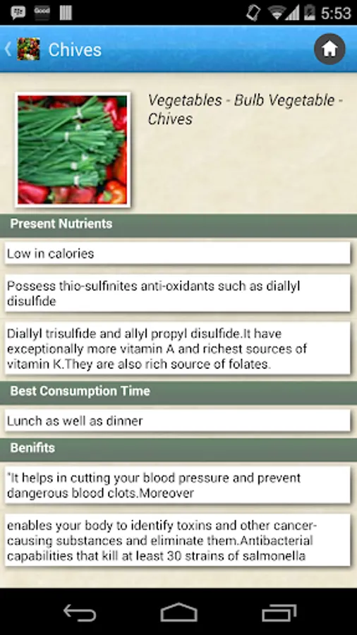 This application contains information like Present Nutrients, Best Consumption Time, Best Consumption Form, Benefits and Side Effects about the food.