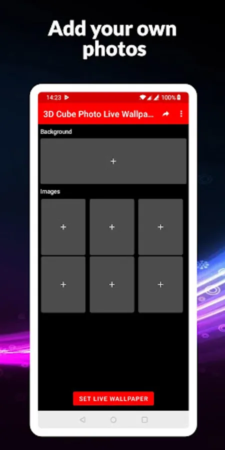 3D Photo Cube live wallpaper provides the different 3D cube live wallpaper. 3D Cube live wallpaper has six sides and each side you set different photos from the gallery. This 3D My Photo Cube live wallpaper features a rotating 3d cube showing pictures and photos from your gallery.
