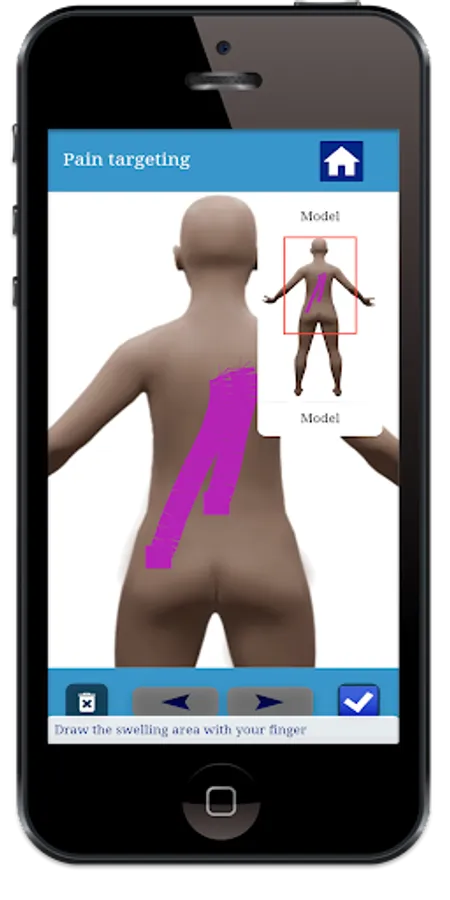 • Maalaa kipualue ja mahdolliset turvotus- ja tunnottomuusalueet mallinukkeen.