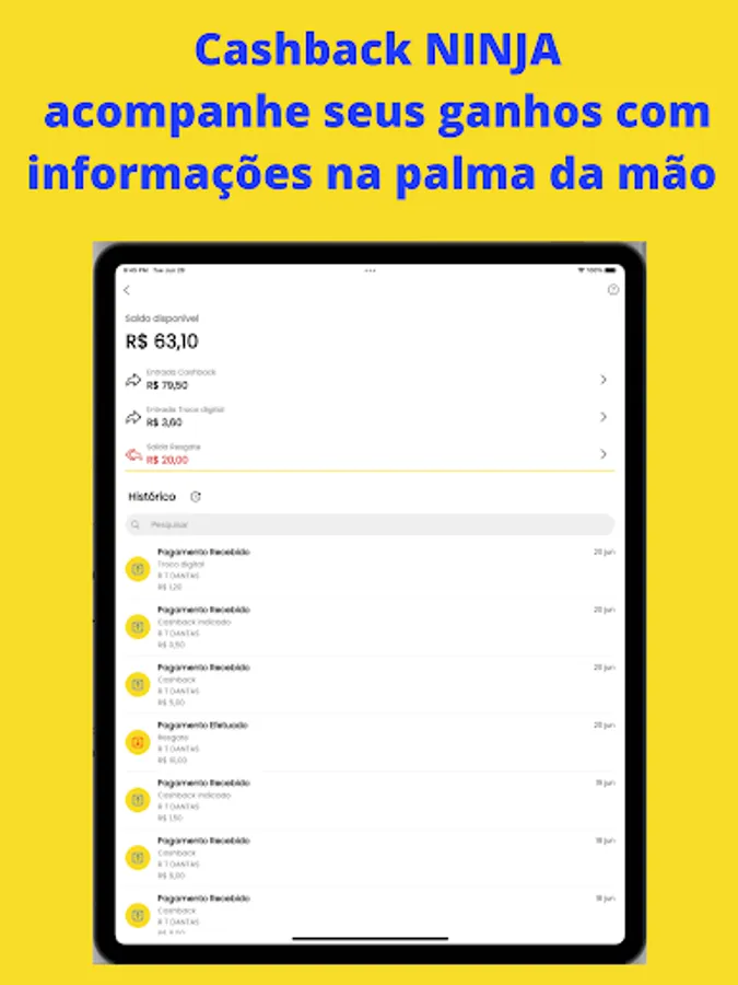 This application was developed to control the amounts transferred in the form of cashback to the company Cashback Ninja, with it you can follow all transactions, balances and extracts.