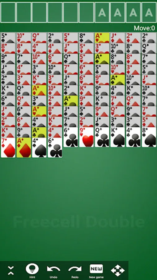 Create four stacks of 13 cards, one per suit in each of the four home cells. Each stack must be built from the low card (ace) to the high (king).