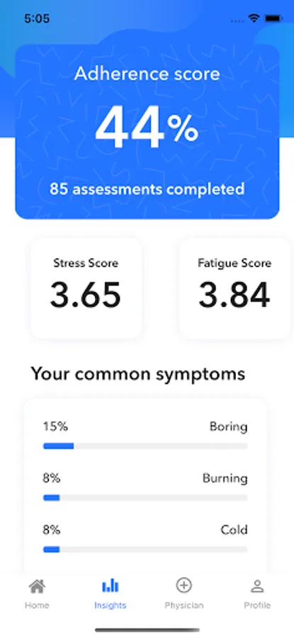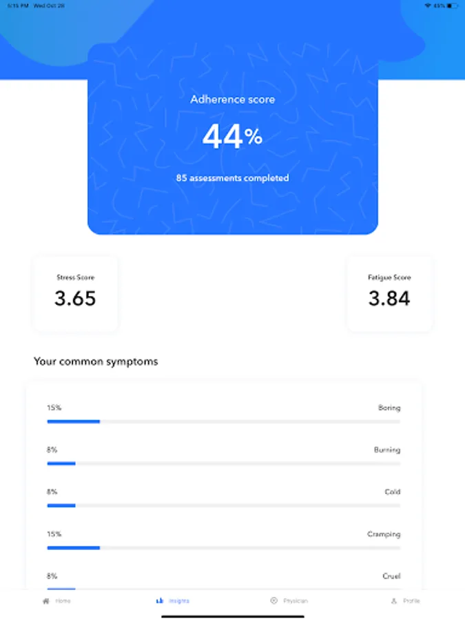 You can choose the location and intensity of your pain on a body and describe its character. Track your happiness, stress, and fatigue. Record your medications, their side effects and more. Information is logged on a frequent basis using unique methods intended to create a simple user experience.