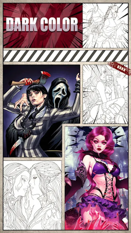 Dark color apps are for you if you like horror scary art clowns, demons, and gothic fantasy coloring, Choose your favorite pics and color each gothic picture with color. When you're done with this scary coloring book, you can let your mind relax and live more comfortably! enjoy artistic coloring!