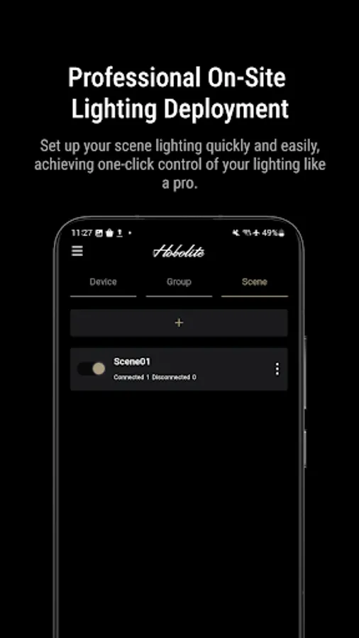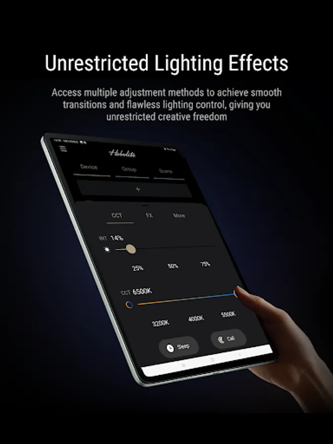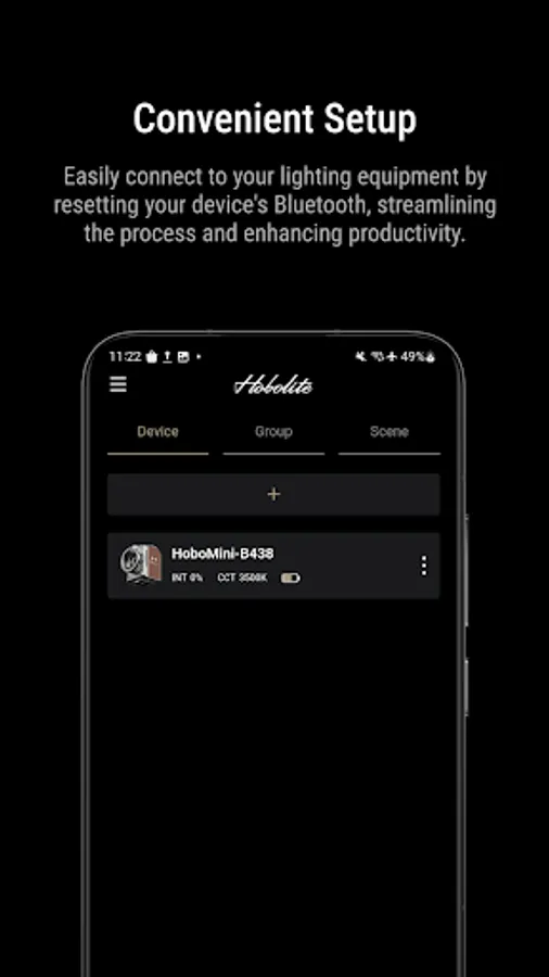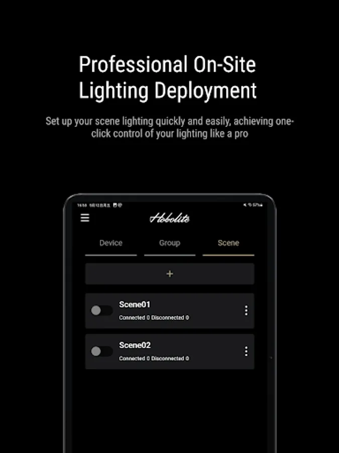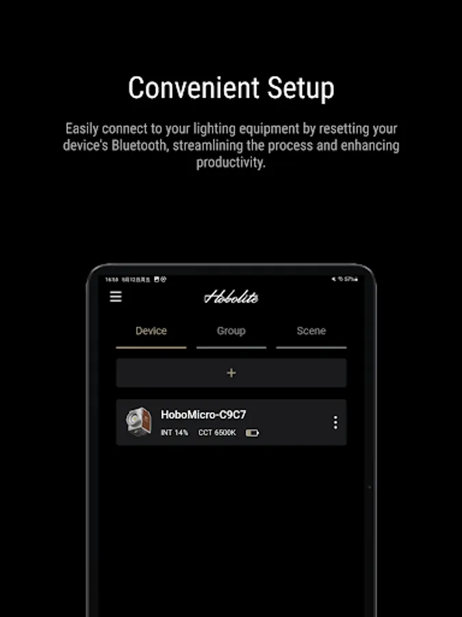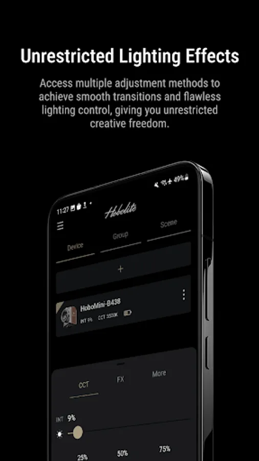 Hobolite's official dimming control App can provide a variety of remote control functions for Mini / Avant / Pro, including brightness and color temperature adjustment, grouping and scene setting, and various light effect control.