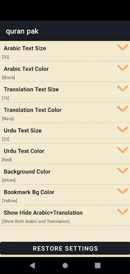 Three main features one is go to diffrent ayah. Second is Bookmark. Third is setting user can customize the app according to his need font increase decrease even color change can be applied to the text as well book mark selection color even background of the surah can changed as well.