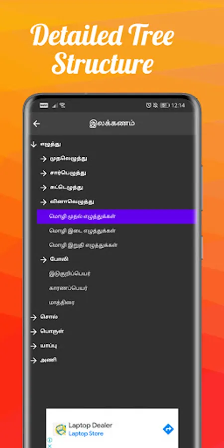 தமிழ் இலக்கணத்தின் உட்பிரிவுகளையும் அதன் துணை இலக்கணங்களையும் கொடுக்கப்பட்டுள்ளது.
