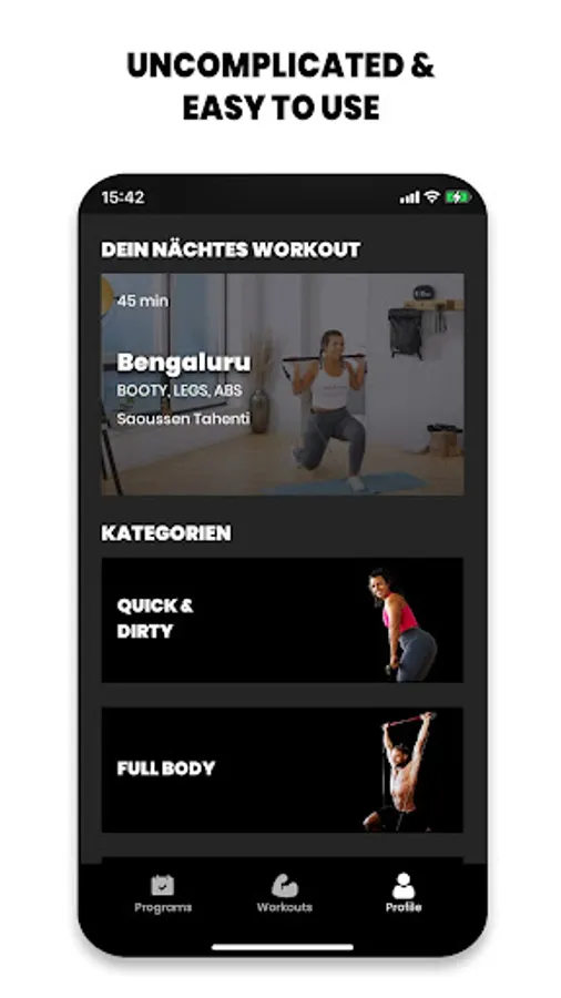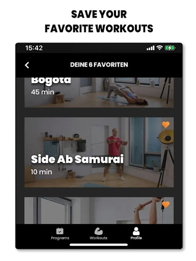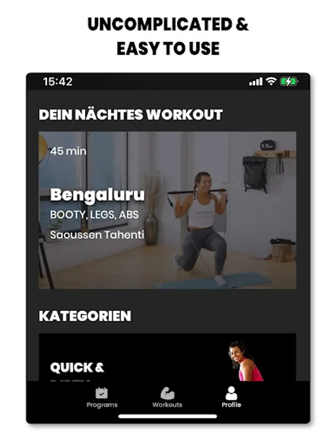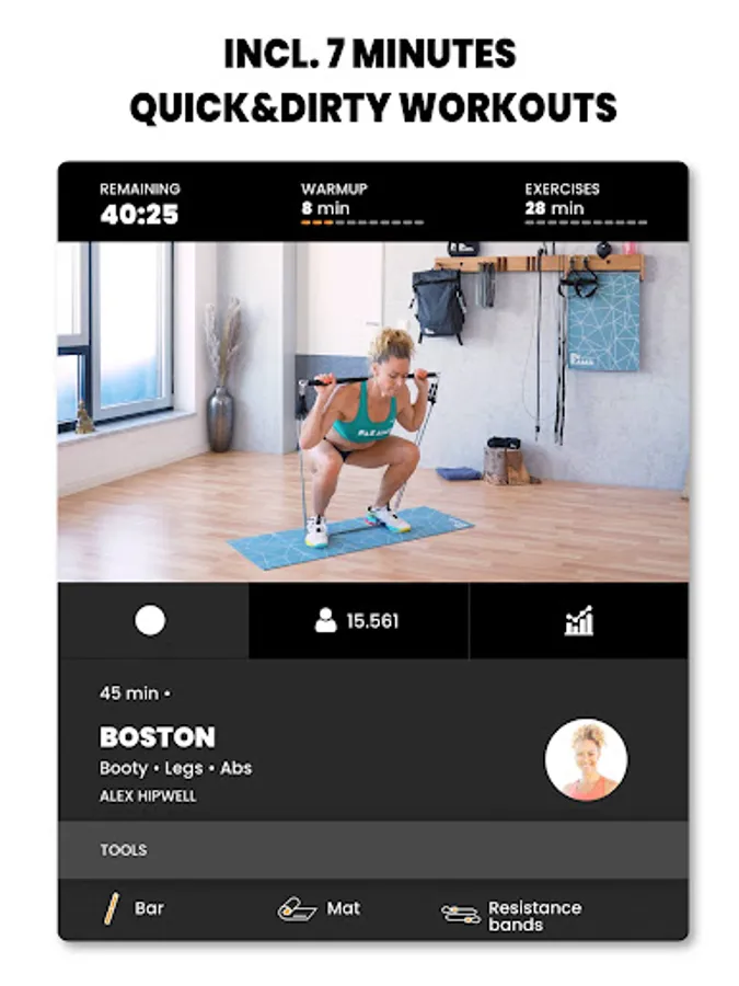 Test yourself in the categories “Full Body”, “Upper Body”, “Lower Body”, “Booty, Legs, Abs”, "Yoga" and “Core” & push your limits.