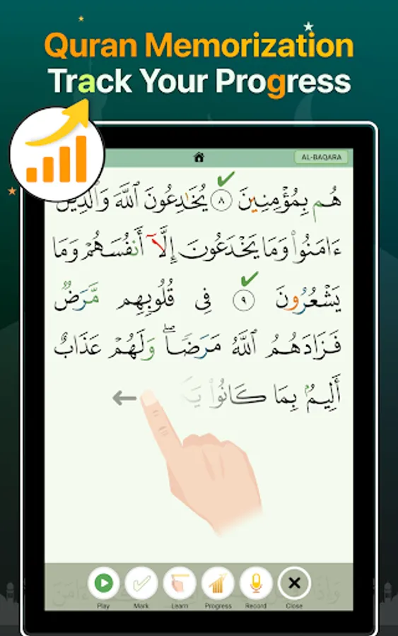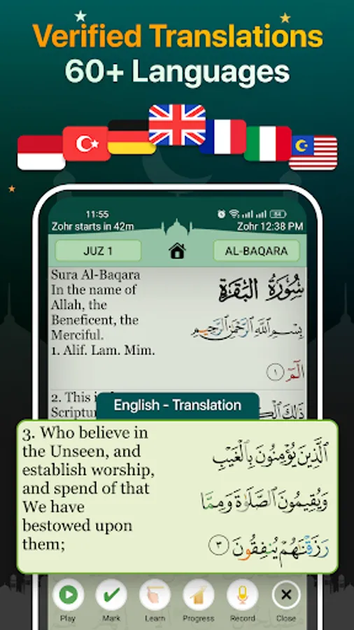 ● Advanced audio options to help with memorization (repetition of the ayah, Surah, number of repetitions, interval, and recitation speed)