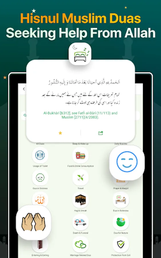 ● Option to display any translation along with full Arabic text in hi-resolution. Supports pinch/zoom feature for changing font size
