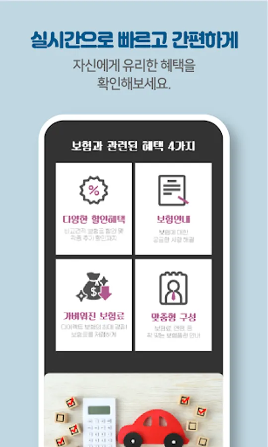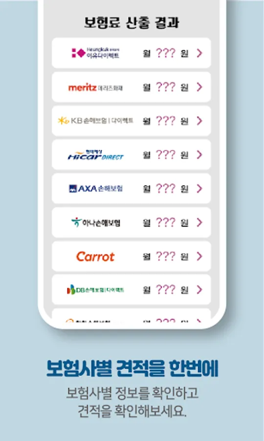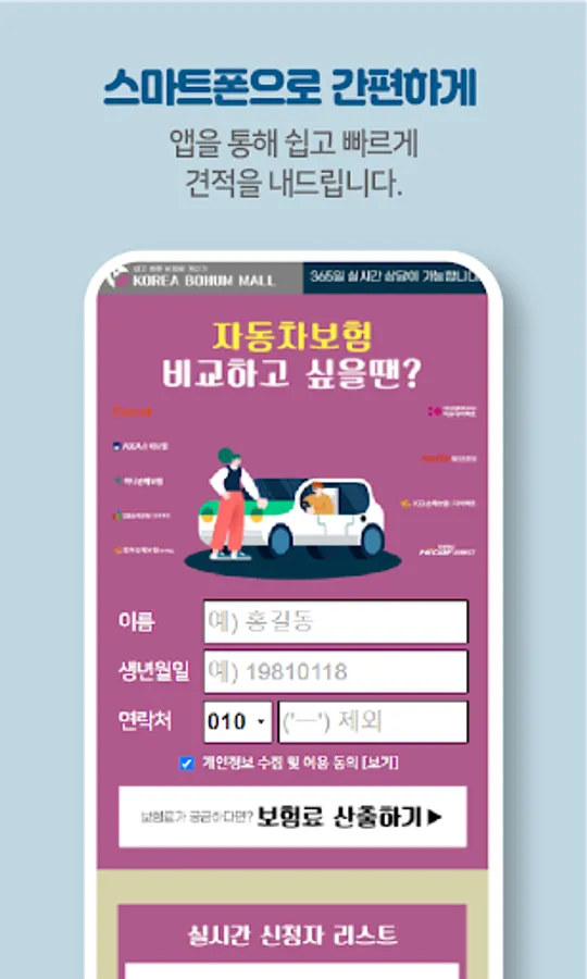 We help you efficiently find information about insurance in one place. A single mobile application provides a comparison quote service anytime, anywhere. We provide quick and easy quotes with your smartphone. Check the information of each insurance company and check the premium! You can quickly and easily check the advantageous benefits that suit you in real time.