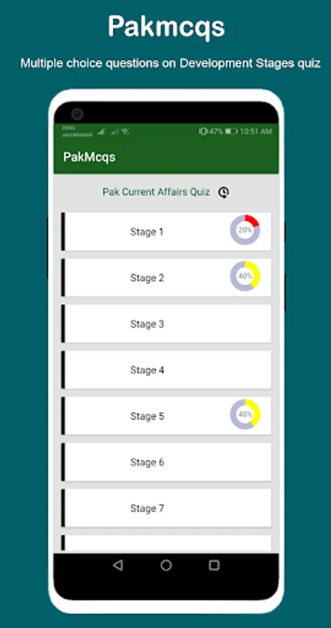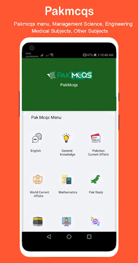 PakMcqs Quiz contain a variety of questions based on various topics like general knowledge, Pakistan Studies, Pakistan current affairs, Islamiyat, Everyday Science etc and too many other fields such as engineering, Mangemnet sciences, Medicals etc are also covered in this App.