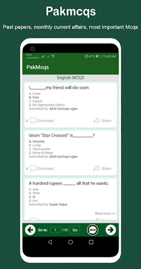 PakMcqs.com is the Pakistan’s Largest Mcqs website, where you can find Mcqs of all Subjects, You can also Submit Mcqs of your recent test and with the help of this app its now possible for all our members to take quiz while you prepare the Mcqs Section.