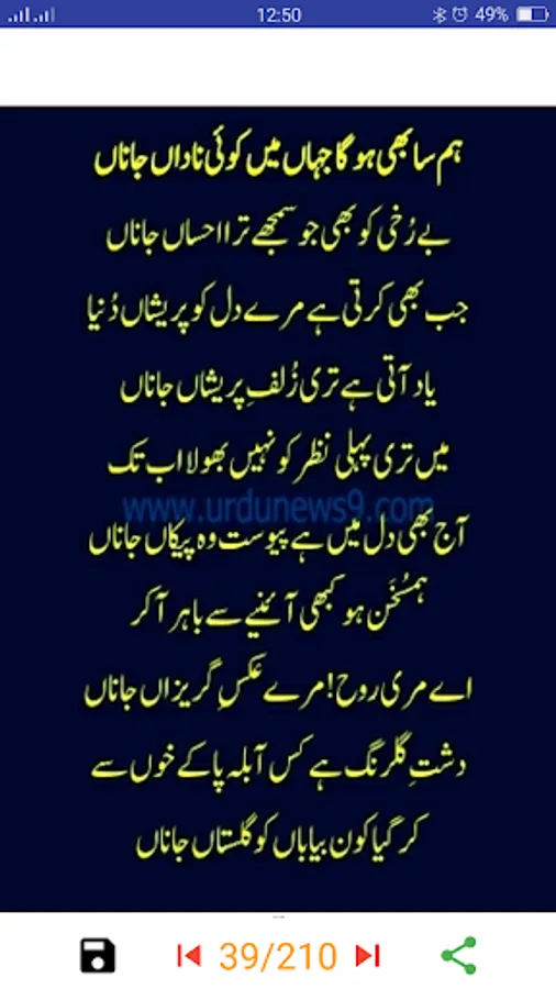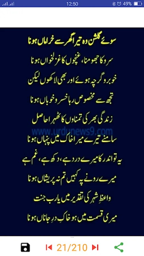 Pir Naseer Ud Din Naseer was a famous of Golra Sharif Islamabad Pakistan in a lari of Peer Mehar Ali Shah. His poetry is most popular in the world. Naseeruddin was born in Nov 1949 Pakistan Golra Sharif Islamabad and died in Feb 2009. Some of the most famous 200 plus Kalam are added to this application. One of the famous names Sunay Kon Qisa e Dard e Dil is already in this app. You can read his poems save in your mobile phone memory and with this, you can share this Urdu Lyrics poetry image with your friends and all social media network.
