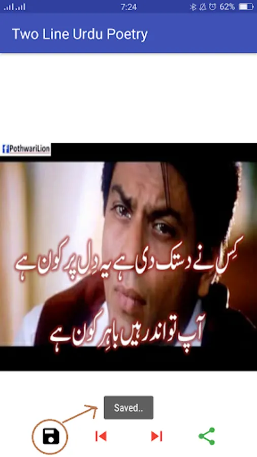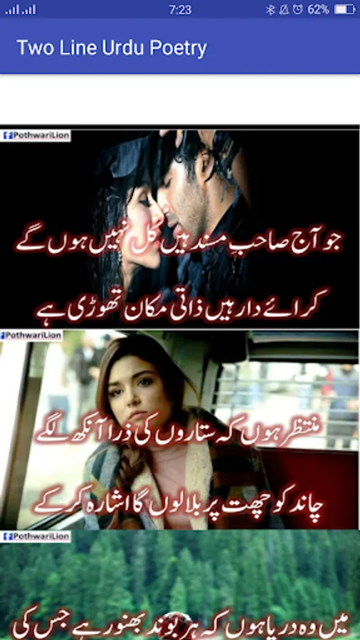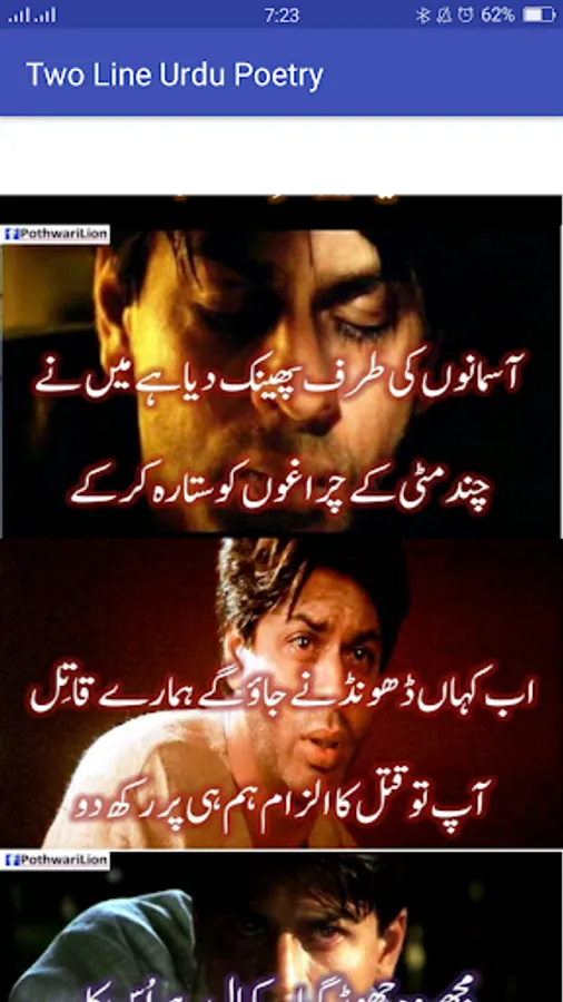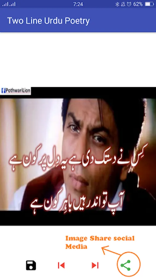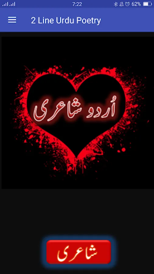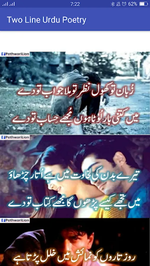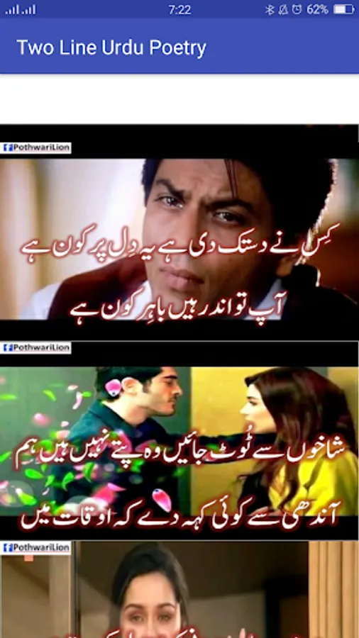 “Two Line Urdu Sad Poetry” is one of the best Shayari Applications there can especially design in Urdu Language images Shayari. In this application, you can share any Urdu poetry images on any social media like Facebook, WhatsApp, Instagram, etc. Urdu Shayari app provides you more than 100 plus Shayari images. You can save images and share with your friends.