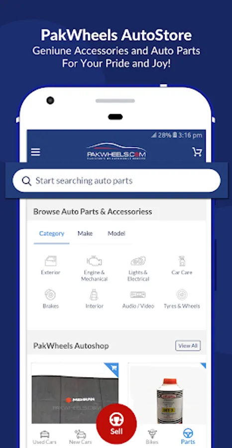 PakWheels Auto Store is your one-stop shop for genuine auto parts. Use PakWheels app to buy and sell spare parts by categories like Interior, Exterior, Engine & Mechanical, Tyres & Wheels, Brakes and Car Care Accessories.