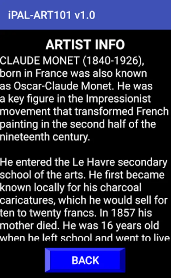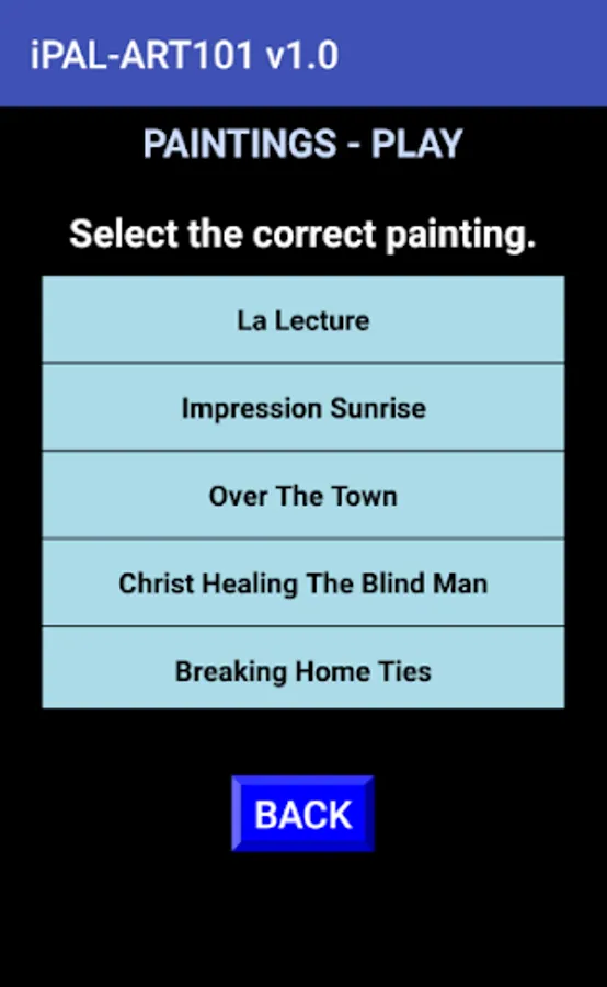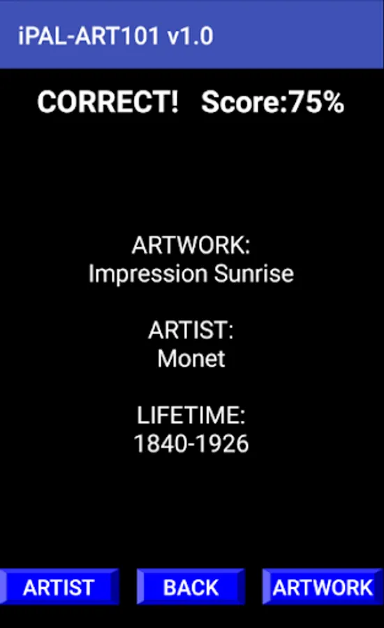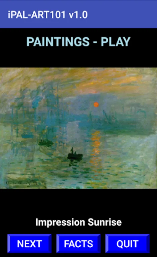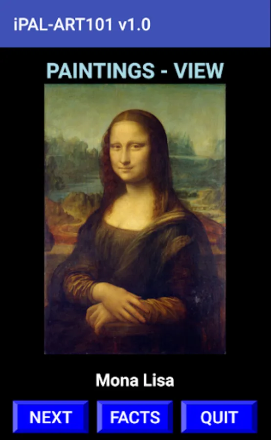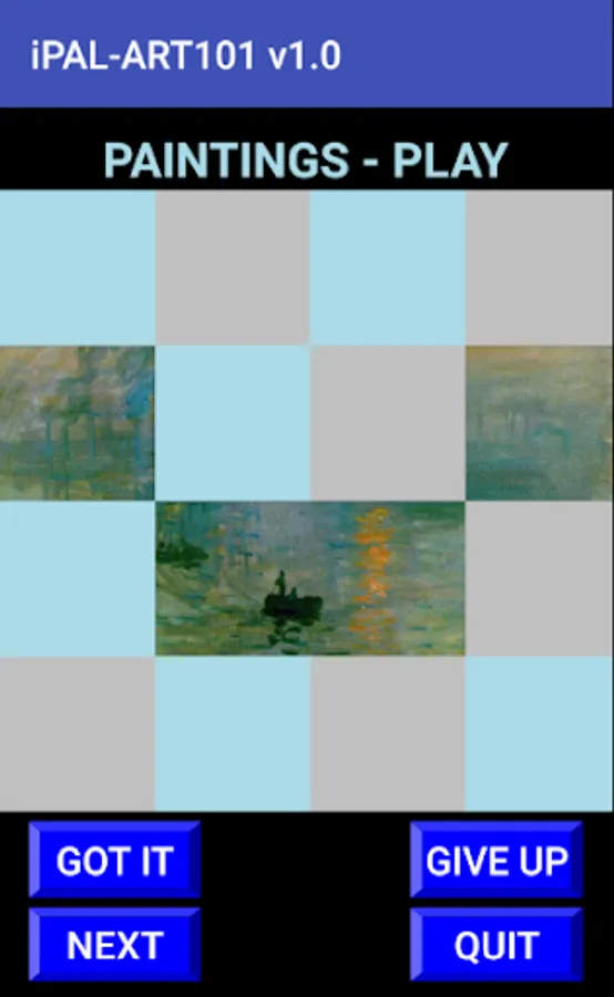 There are over 125 painting masterpieces here to challenge your knowledge in this fun game by having you identify the works of art from only partial views. PLAY lets you remove cover tiles slowly to reveal the artwork and gives you credit for the quickest correct solution with the most tiles uncovered. Alternatively, you can skip the game (PLAY) and choose to revel in the masters' works by just viewing them, one at a time with the VIEW button and (optionally) read pertinent facts about the painter and the painting.