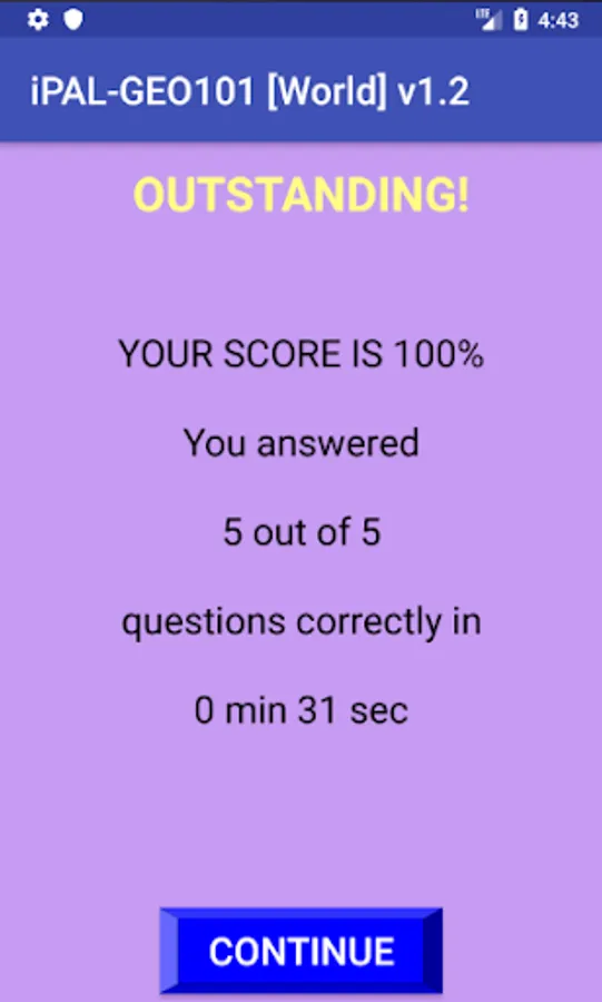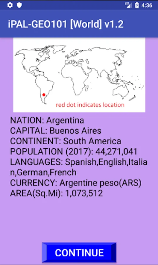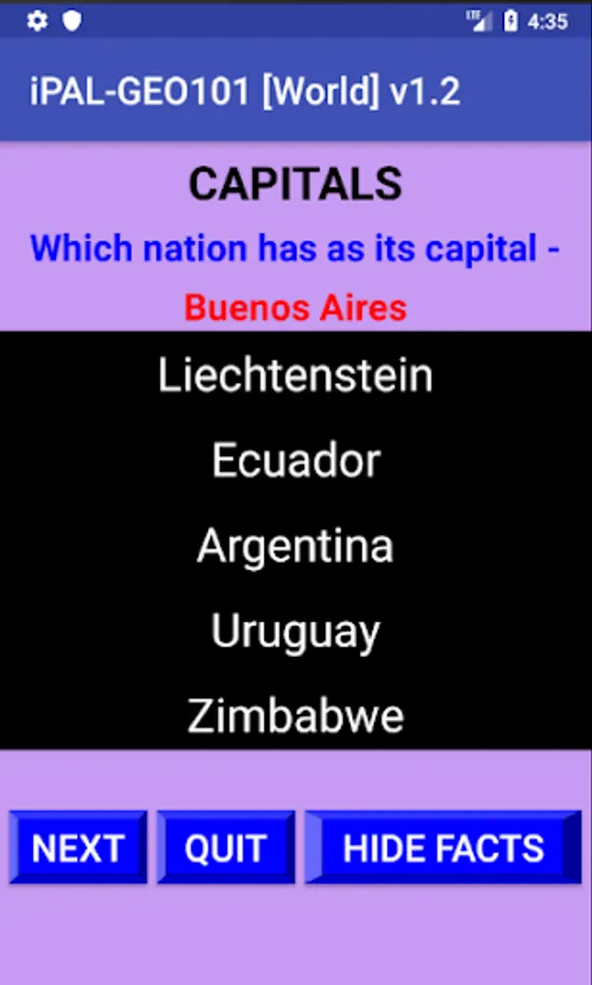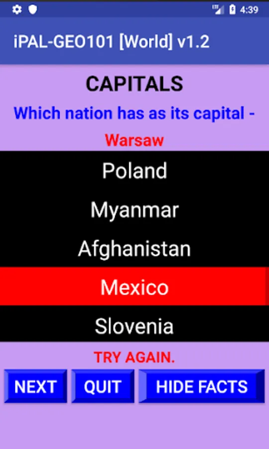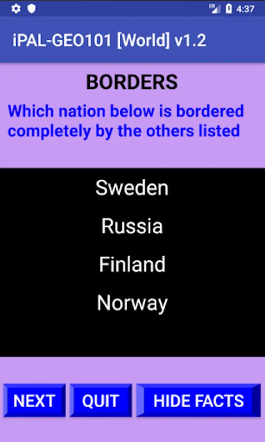 Once you select the correct answer from the list, pertinent facts about the country will be displayed; you have the option to bypass this feature.